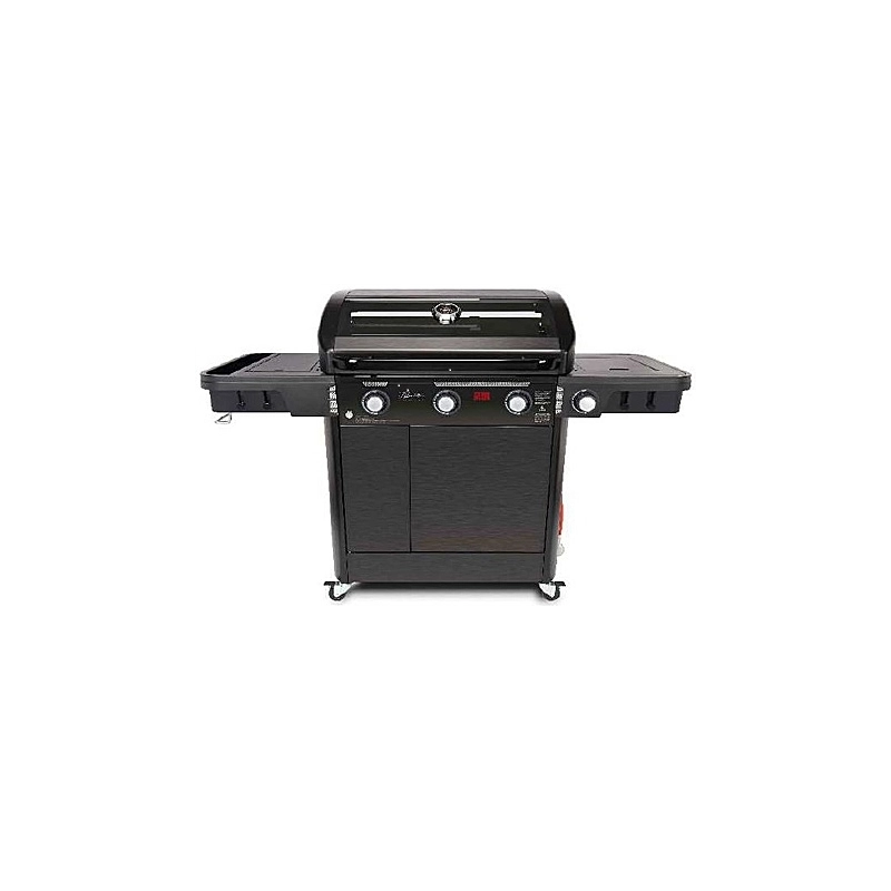 Struttura in acciaio verniciato di colore nero. Piano di cottura principale mm 720x480 composto da 1 piastra smaltata in ghisa e 1 griglia smaltata in ghisa. 3 bruciatori in acciaio con potenza massima 10,2 Kw. Coperchio con ampia maniglia di apertura e termometro. 1 ripiano laterale. Piano cottura laterale con sistema ad infrarosso da 3,1 Kw. Con ruote. Dimensioni 155,5x53,5x118h cm.