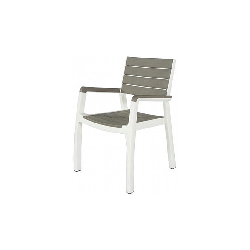 Sedia con doghe con finitura effetto legno. Realizzata in resina di alta qualita' resistente agli agenti atmosferici e ai raggi UV. Con comodi braccioli di appoggio. Colore seduta/schienale cappuccino, struttura bianca.