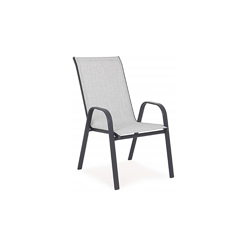 Sedia con braccioli con struttura in acciaio. Seduta e schienale in textilene 2x1. Impilabile. Colore grigio.