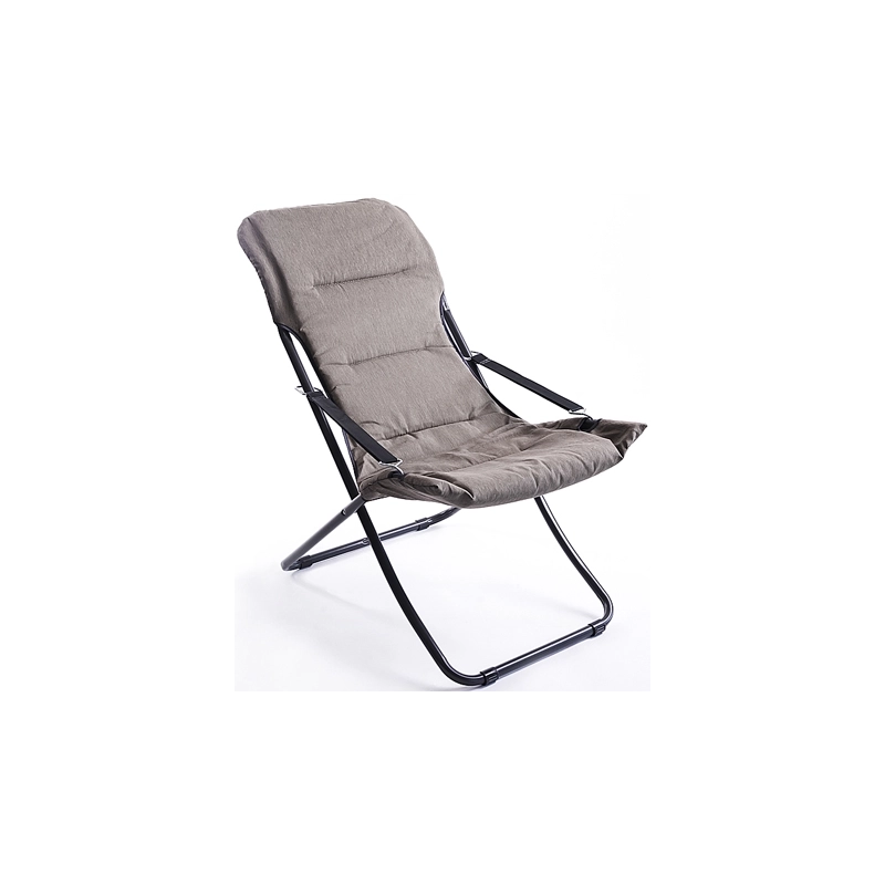 Poltrona sdraio imbottita, pieghevole con struttura in tubo d'acciaio diametro 24 mm colore scuro, fodera e imbottitura in poliestere 65% e 35% cotone. Piedini antiscivolo e braccioli in tessuto. Regolabile in 3 posizioni.