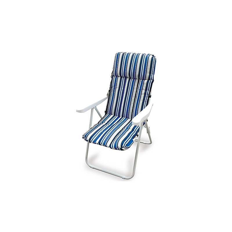 Struttura in acciaio verniciato con cuscino imbottito in cotone. Pieghevole e regolabile in 5 posizioni. Molleggio con molle in acciaio zincato. Colore fantasie assortite