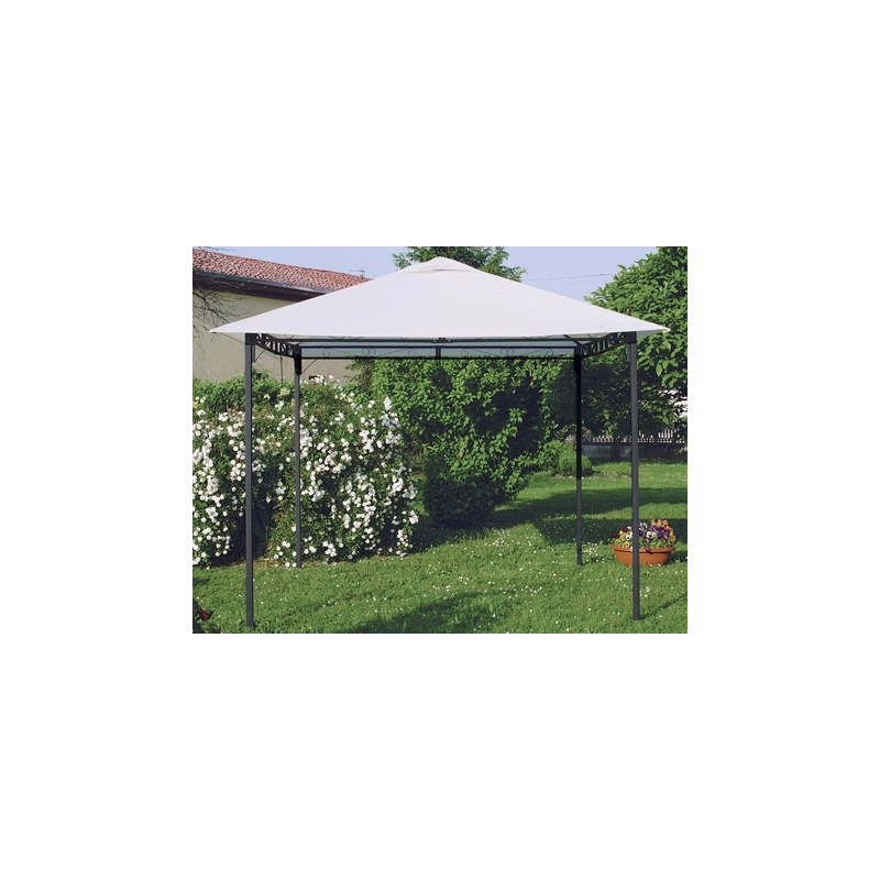 Gazebo con struttura in ferro verniciato color antracite, palo 40x40 mm e copertura colore bianco in poliestere da 180 gr/mq. Dimensioni 3x3 m, altezza 2,05-2,50 m.