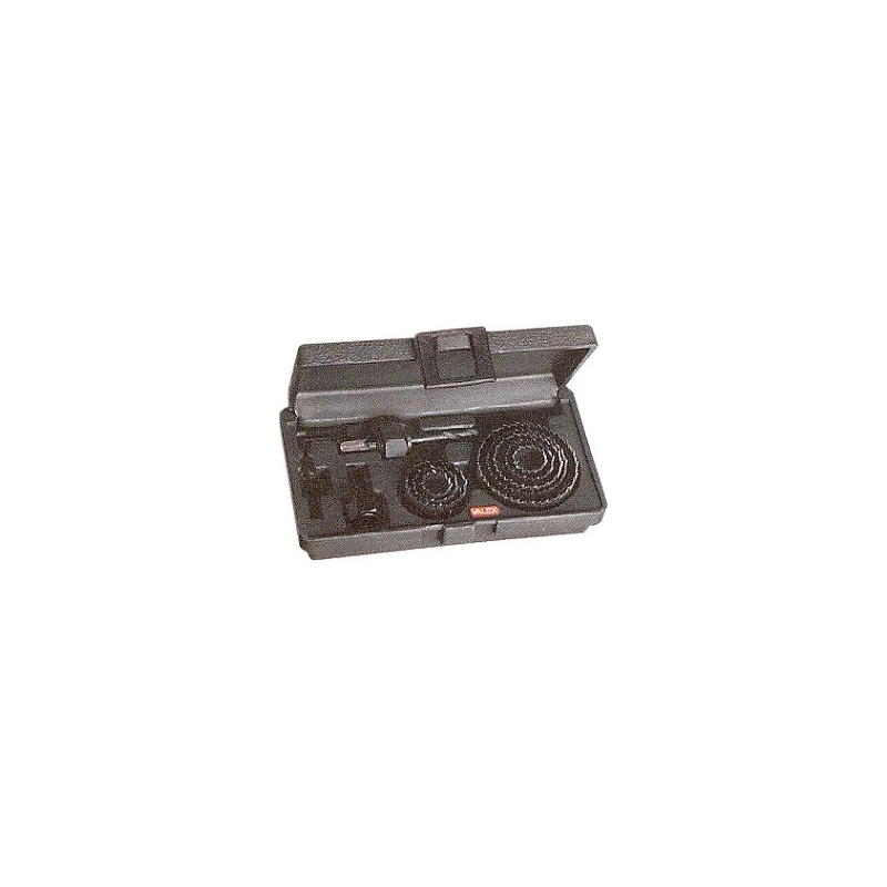 In valigetta plastica. 8 frese diametro di taglio da mm 19 a mm 64. Profondita' di taglio mm 24. 1 albero con punta, 1 mandrino, 1 chiave esagonale.