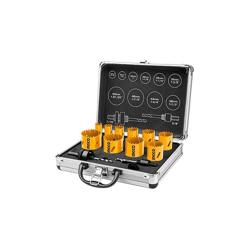 Set composto da 10 seghe a tazza bimetal e 2 alberi. Diametro seghe a tazza: 20 mm, 22 mm, 25 mm, 29 mm, 32 mm, 35 mm, 38 mm, 44 mm, 48 mm e 50 mm. In valigetta.