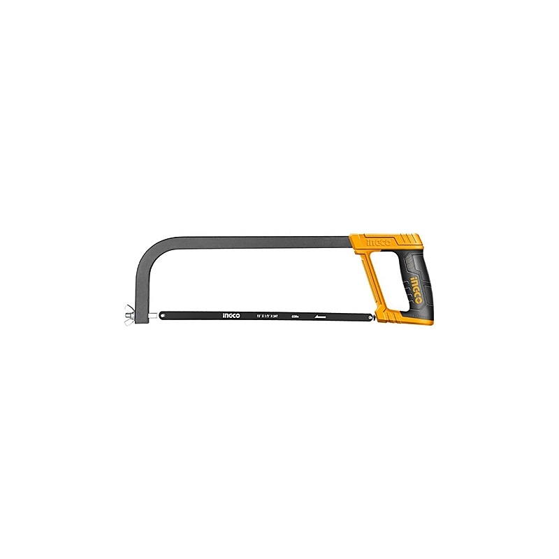 Seghetto manuale con impugnatura bicomponente per taglio metallo. Tendilama a galletto regolabile. Lunghezza 300 mm.
