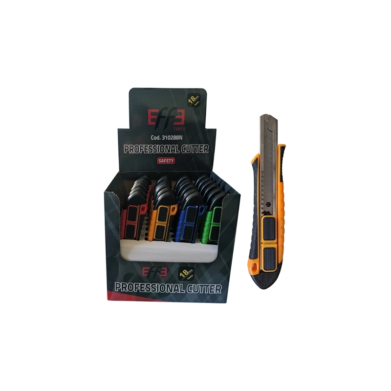 Espositore 24 cutter. Corpo in materiale sintetico con anima metallica ed impugnatura bi-componente. Doppia funzione del pulsante: lama retrattile automaticamente con funzione antinfortunistica o bloccabile aperta. Lama in acciaio SK5 da mm 18.