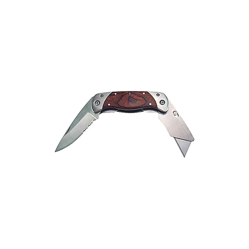 Coltello chiudibile + cutter trapezio con manico in legno. Lama coltello in acciaio con parte seghettata. Cutter con lama trapezoidale, per lame tipo H48 e TGL65. Lunghezza totale aperto 170 mm. Fornito in custodia con passante cintura.