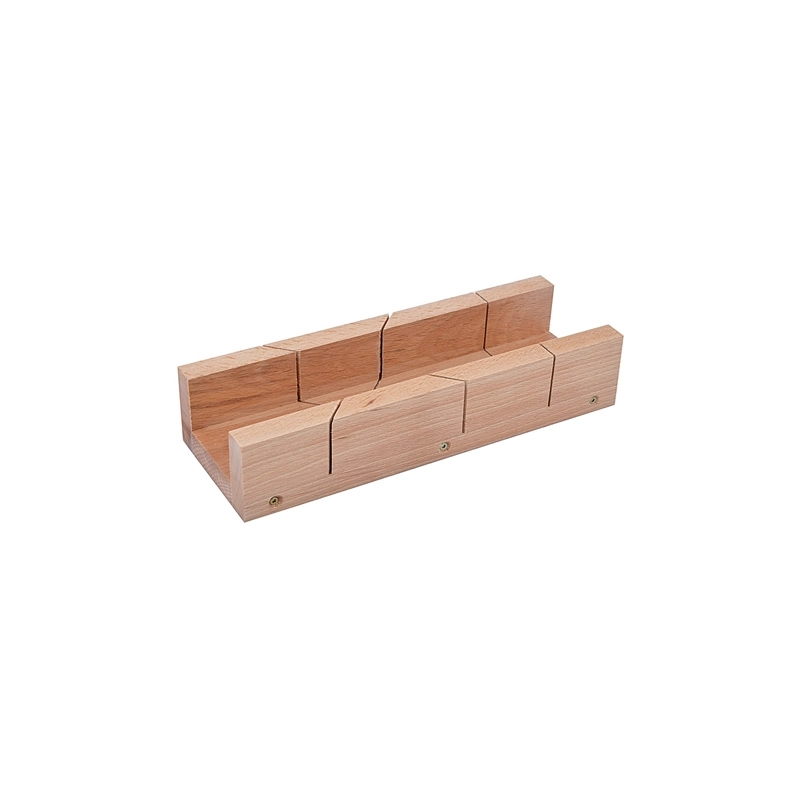 Tagliacornici in legno di faggio. Angoli di taglio 90-45 gradi. Spessore mm 19. Dimensioni mm 350x140x50. Peso 1,20 kg.