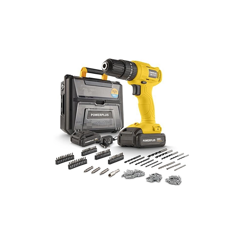 Avvitatore 20V con 2 batterie 1300 mAh Li-ion. 2 Velocita' 0-400/1500 giri/min. Reversibile. Mandrino autoserrante da 10 mm. 30 Nm di coppia. 18 posizioni di frizione. Luce a Led frontale. Impugnatura morbida softgrip. 158 Accessori inclusi. In valigetta