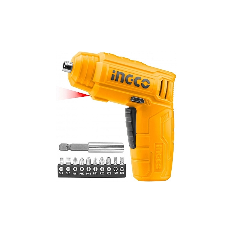 4 V. Attacco da 1/4'. Velocita' a vuoto 180 giri/min. Coppia Max 4 Nm. Inclusi 1 portapunte magnetico e 10 inserti Cr-V da 25 mm. Cavo batteria USB. Con luce Led.