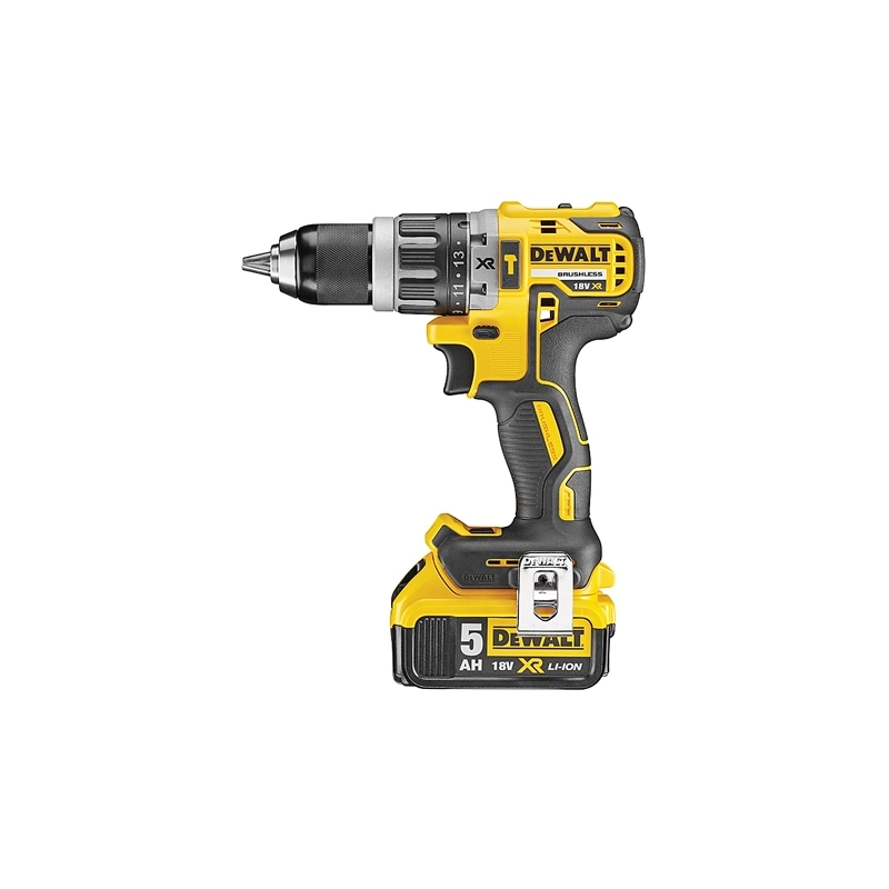 Trapano avvitatore con motore BRUSHLESS 18 V. Mandrino autoserrante mm 13. Con percussione. Coppia di serraggio 70 Nm. Velocita' a vuoto 0-550/2000 giri/min. Peso kg 1,60. In valigetta con 2 batterie XR da 5,0 Ah al litio che assicurano piu' del doppio dei cicli di ricarica delle altre batterie. Con caricabatterie, porta inserti magnetico, gancio per cintura. In valigetta.