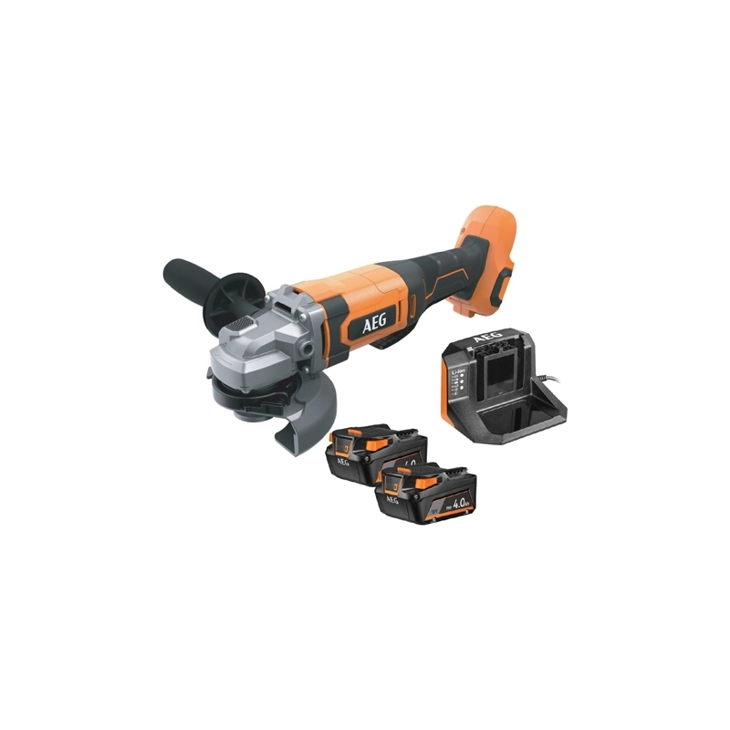Smerigliatrice angolare. Velocita' a vuoto 9200 giri/min. Diametro disco 115/125 mm. Con 2 batterie da 4 Ah e caricabatterie.