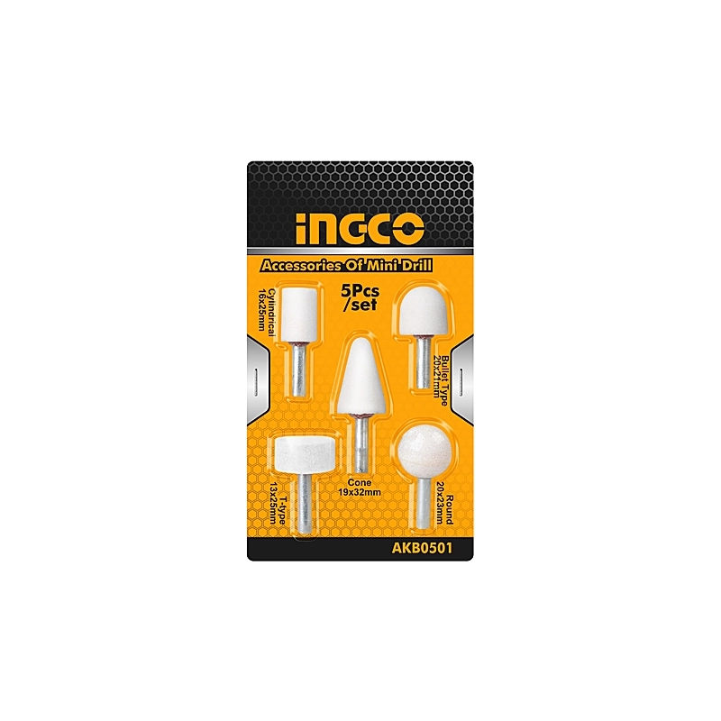 Set di 5 mole smeriglio con gambo. Composto da 1 con punta cilindrica 16x25 mm, 1 con punta a proiettile 20x21 mm, 1 con punta a cono 20x32 mm, 1 con punta a T 24x10 mm e 1 con punta arrotondata 20x20 mm.