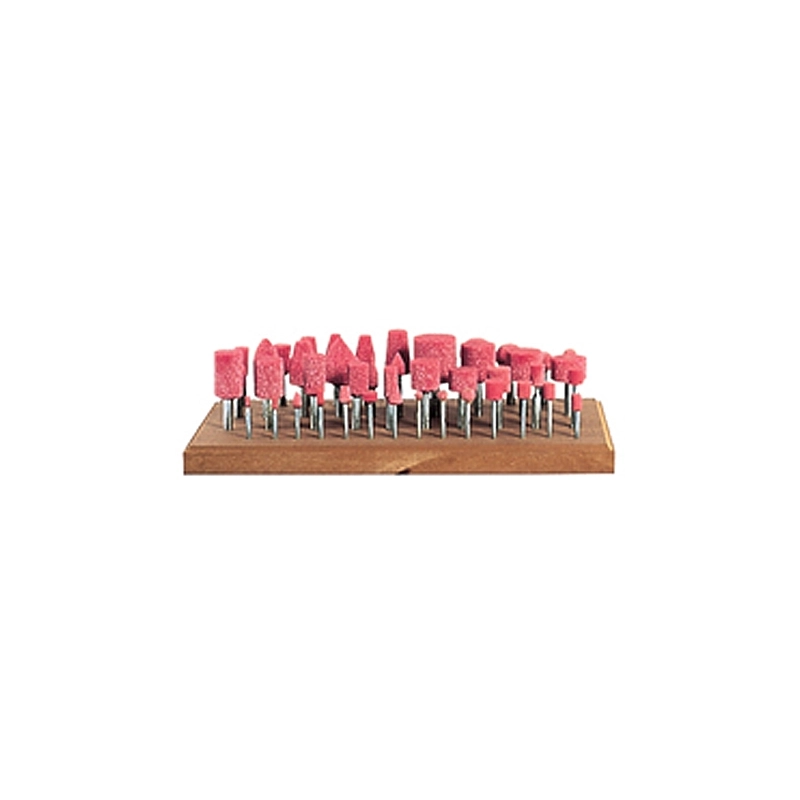In corindone rosa. 45 mole assortite di diametro 3-6 mm. Per rettifica interna, esterna, per finitura, pulitura, incisione. Per metallo, vetro, materie sintetiche e ceramica.