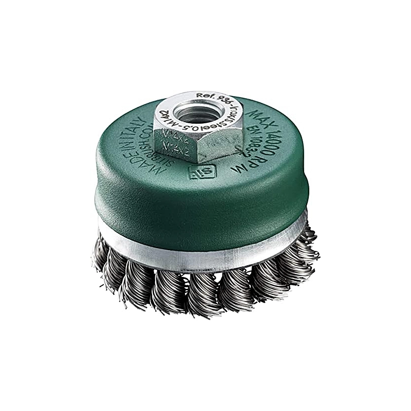 Spazzole professionali con filo inox diametro mm 0,30 ritorto in trefoli. Progettata per operare ad elevati regimi di rotazione (circa 14000 giri/min). Dimensioni mm 70x17. Attacco M14.