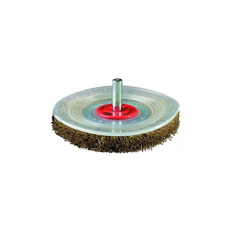 Spazzola circolare ottonata con protezione, diametro 75 mm, codolo 6 mm. Max velocita' 6000 rpm