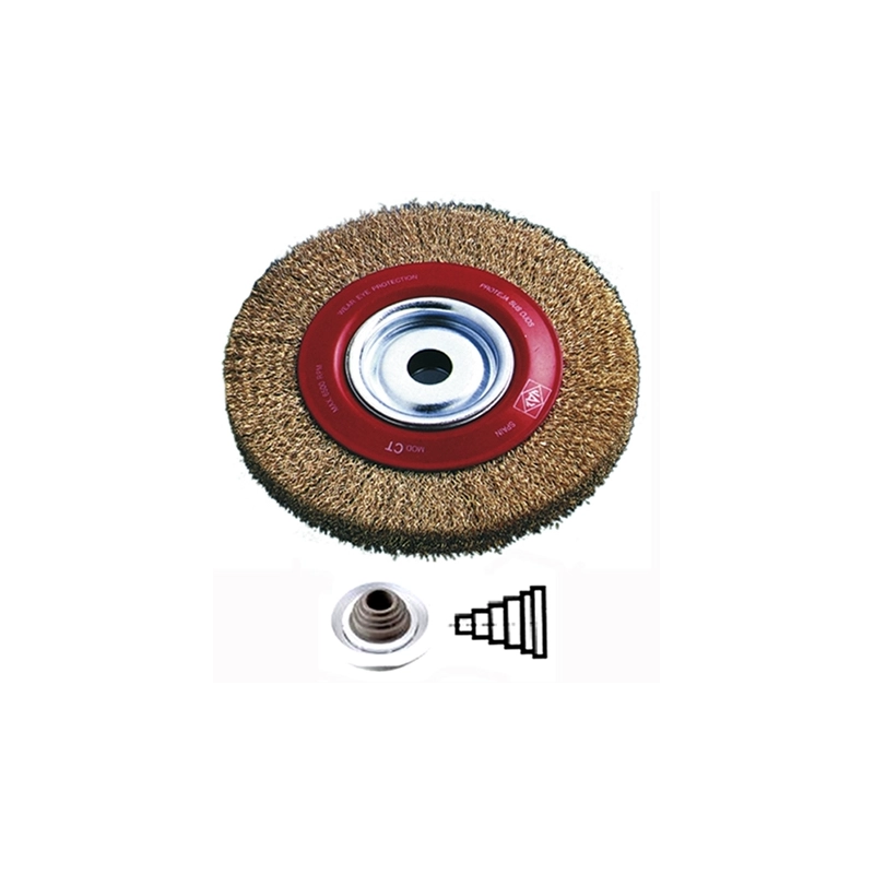 Utilizzabile sia su macchine fisse che portatili con adattatore multiforo con diametro mm 13,16,20,22, 26,30,50. Con filo in acciaio ottonato diametro mm 0,30. Rotazione massima 6500 giri/min. Modello = diametro spazzola mm x spessore mm