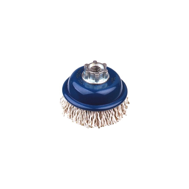 Progettata per utilizzo su elettroutensili portatili. Adatta per lavorare su superfici estese. Filo in acciaio arricciato in trefoli da 9 fili (3x0,20 e 6x0,35) rivestiti di plastica. Diametro mm 75. Attacco 14MA. Rotazione max 15000 giri/min.