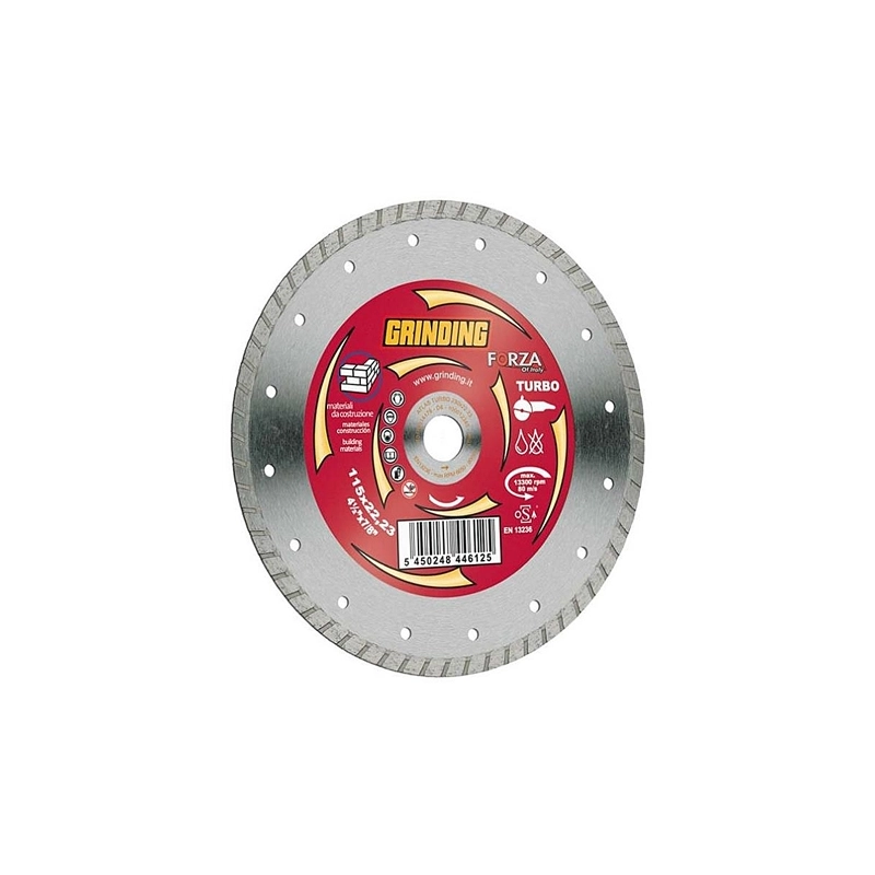 Disco sinterizzato a corona zigrinata adatto per utilizzo generico su materiali da costruzione. Foro da 22,2 mm. Modello = dimensioni mm/max giri-min