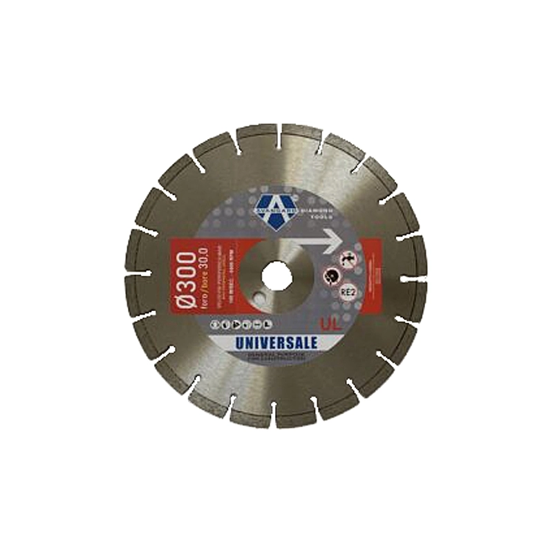 Disco diamantato professionale a settori, saldatura al laser. Per taglierine da cantiere. Ideale per cemento, cotto e mattoni. Adatto anche per cemento armato, betonella, ghiaino lavato, poroton, marmo, granito, tufo e klinker. Altezza corona 10 mm. Modello = diametro mm/foro da mm