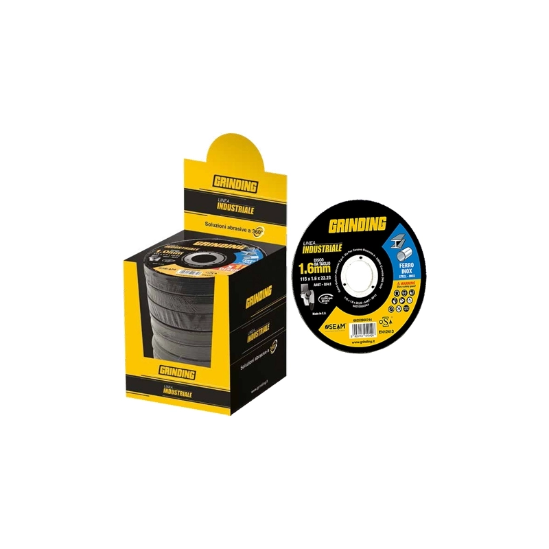 Disco abrasivo da taglio all'ossido di alluminio. Esente da ferro, zolfo e cloro (<0,1%). Taglio veloce e preciso. Pratico confezionamento da 5-10 pz, utile per la vendita multipla e poi in box-espositore. Modello = dimensioni mm/tipo/box da pz