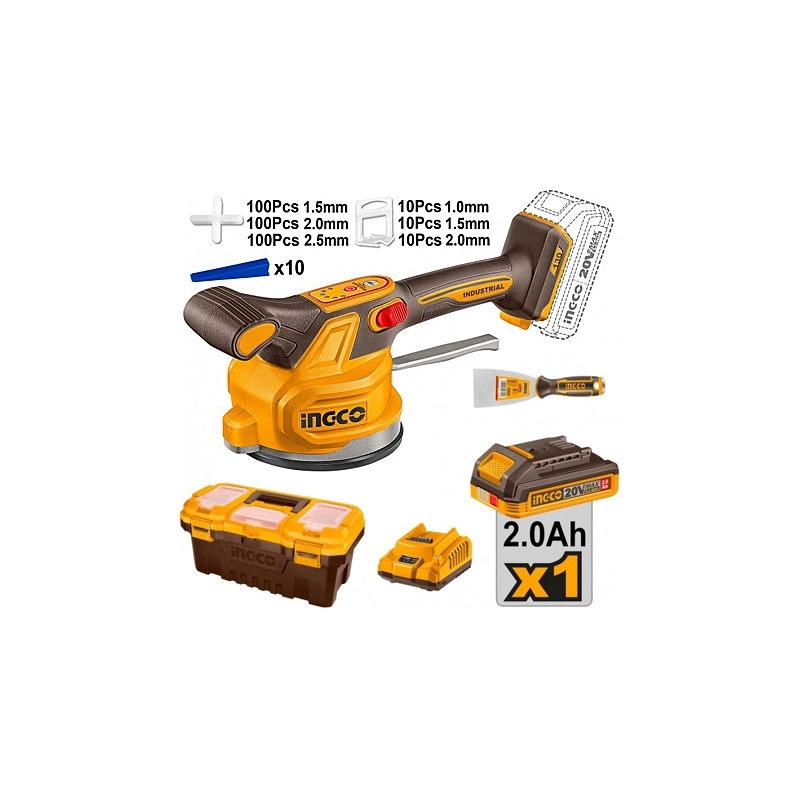 20V. 0-10000 giri/min. Forza di assorbimento 60 kg. Diametro della ventosa 130 mm. Con 1 batteria da 2,0 Ah, caricabatterie, una spatola per stucco, set distanziatori, set livellatori, set inserti livellatori e valigetta.