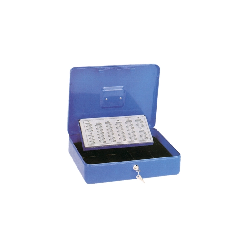 In lamiera pesante verniciata, con cilindro di sicurezza posto sul frontale, comprensiva di portamonete per euro. Dimensioni mm 300x240x95
