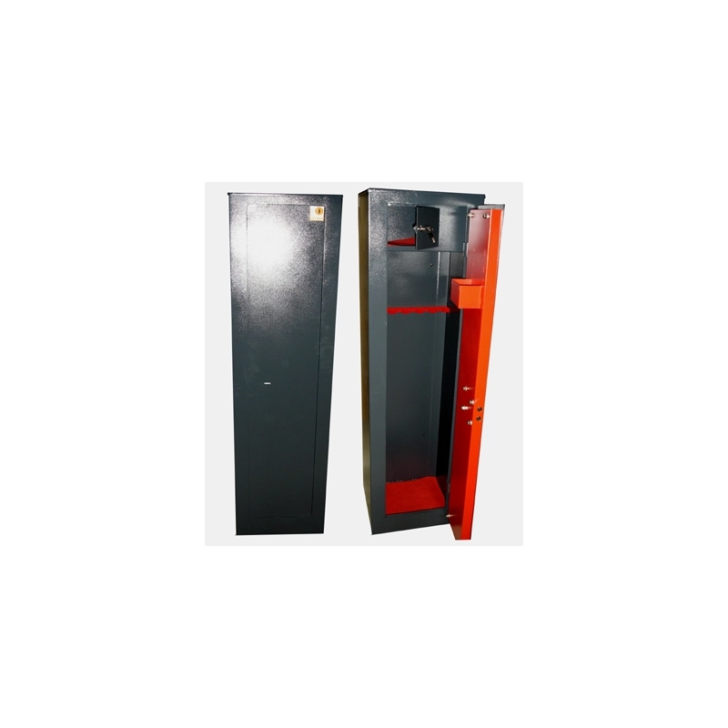 Struttura in lamiera d'acciaio spessore di mm 3. Catenaccio antisega diametro 18 mm. Chiave a doppia mappa. Predisposizione per l'ancoraggio a parete con tasselli. Completo di supporti per la collocazione di fucili e vano tesoretto con chiave. Modello = numero posti/dimensioni cm