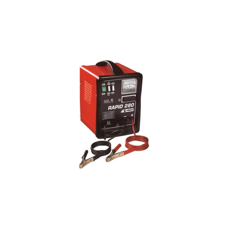 Caricabatterie portatile con aiuto avviamento. Dotato di amperometro, protezione contro avviamenti prolungati. Potenza assorbita 460 W. Tensione di carica 12 V. Corrente di carica 25 Ah. Peso kg. 12,6.