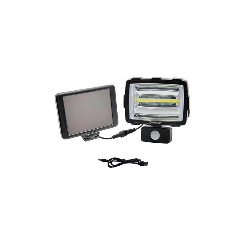 Faro COB LED 10 W con panello solare e accumolatore. 1600 lumen. In plastica di colore Nero. Con sensore e crepuscolare. Dimensioni 21x16,2x12,7 cm.