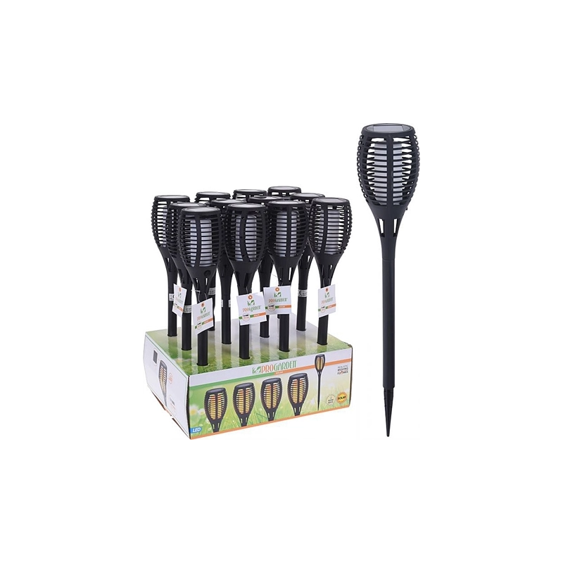 Fiaccola solare a Led in materiale plastico. Effetto fiamma. Con pannello solare per ricarica. Diametro 10 cm. Con puntale per fissaggio a terra, altezza massima 58 cm. Pulsante On/Off.