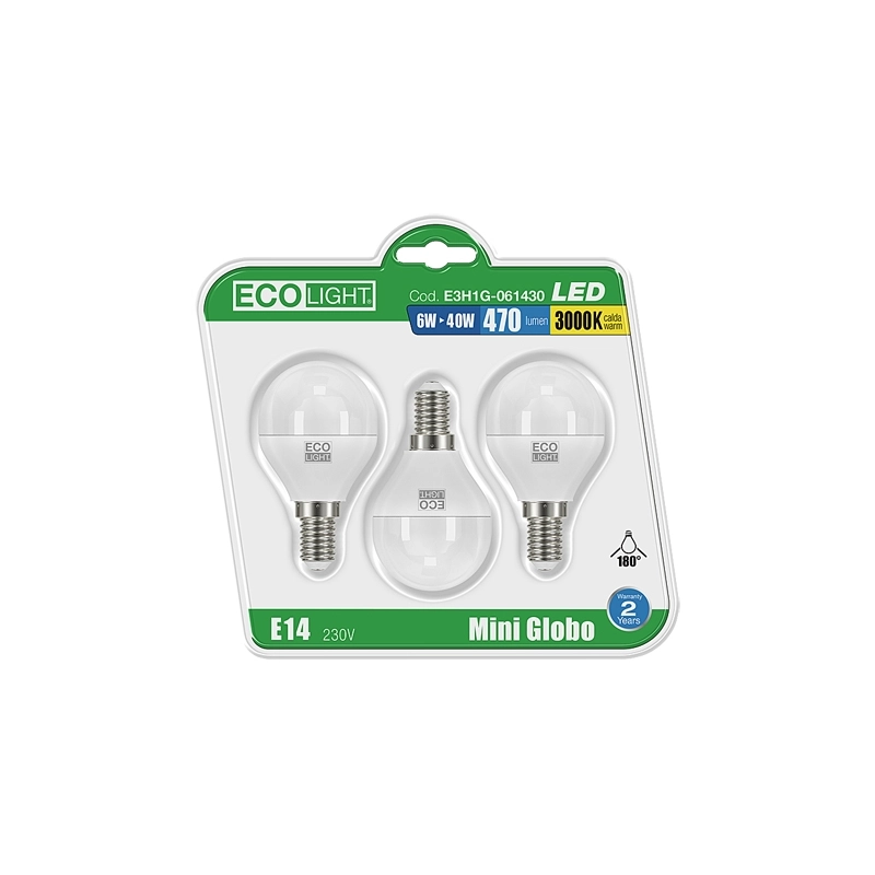 Attacco E14. Luca calda 3000 K. Durata media 20000 ore. 6 Watt, 490 Lumen. Dimensioni 45x80 mm. In box da 3 pz.