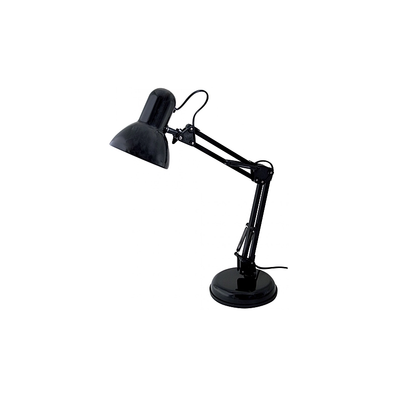 Lampada da scrivania con attacco lampadina E27 (non inclusa). Braccio snodabile, con cavo di alimentazione da 150 cm, interruttore e spina. Per camere, scrivanie e studi. Colore nero. Dimensioni 130x115x325 mm