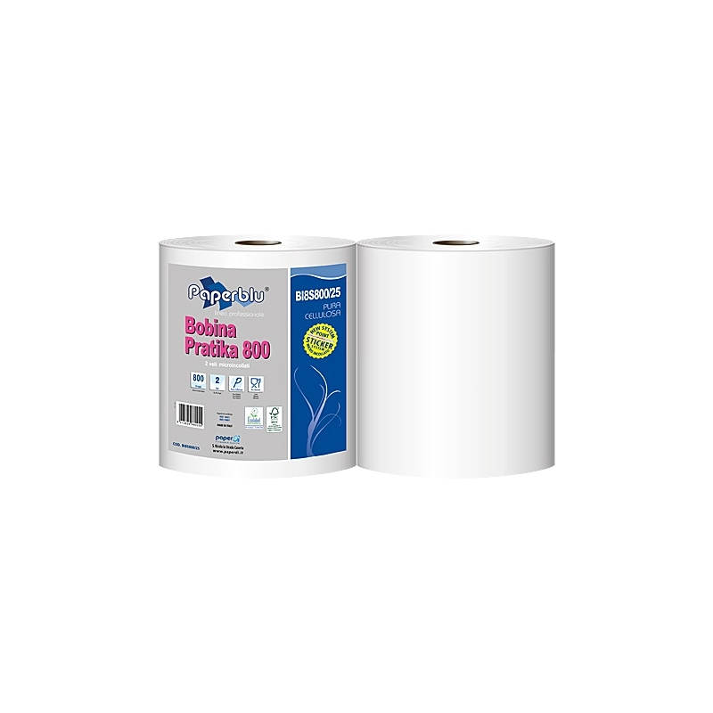 Bobine industriali in pura cellulosa 2 veli, microincollati. Dati singolo rotolo 800 strappi da cm 25x25, lunghezza 200 mt. Certificata Ecolabel. Certificata per uso alimentare. Peso per velo 16 gr/m2. Peso kg 3,30 alla coppia.