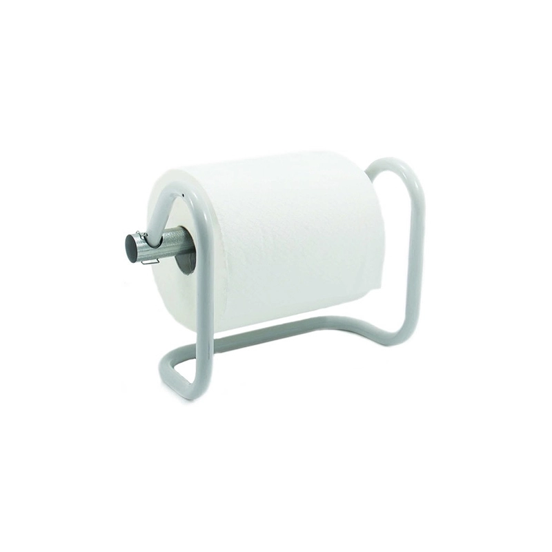 Portarotolo da muro o da tavolo in acciaio rivestito in gomma. Dotato di frizione che consente lo strappo senza bisogno della lama ed evita lo srotolamento della bobina. Supporto a muro aperto che consente la rimozione veloce per utilizzo in altri ambienti. La struttura rivestita in gomma garantisce la massima igiene. Dimensioni 40x19x29h cm. Colore bianco.