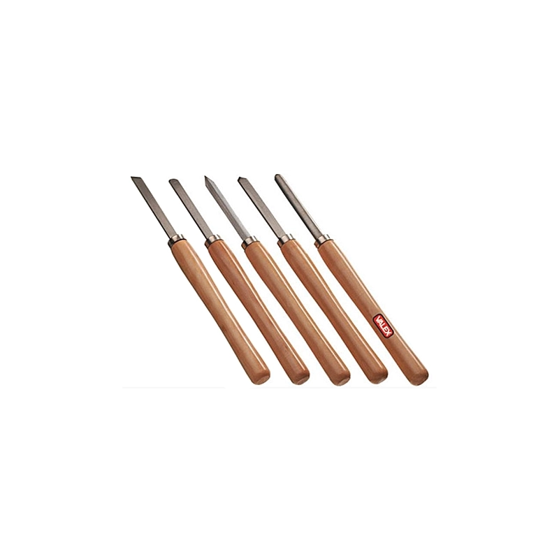 Serie 5 pezzi di coltelli riaffilabili per tornio da legno. Impugnatura ergonomica in legno. Lunghezza totale cm 36, lunghezza lama cm 14. Forma punte: tonda, convessa, taglio inclinato, ad angolo con diversa inclinazione.