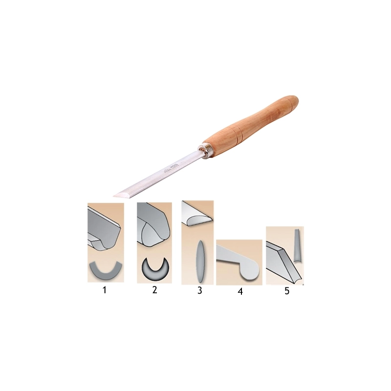 Sgorbia professionale per tornio in acciaio HSS con durezza 63 HRC. Manico ergonomico in legno di ontano. Lunghezza manico 300/400 mm. Lunghezza totale 480/650 mm. Modello = numero immagine/cod.fornitore/misura mm
