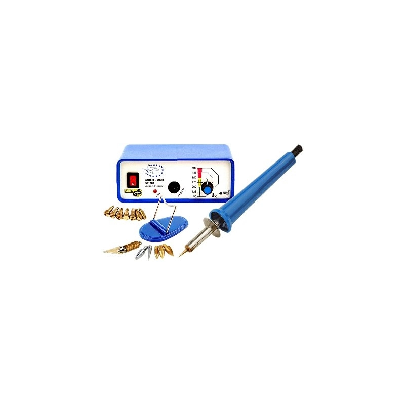 Completo di stazione con temperatura regolabile 50 - 500 gradi C. Pirografo potenza W 20 con supporto e 14 punte e stampi intercambiabili.
