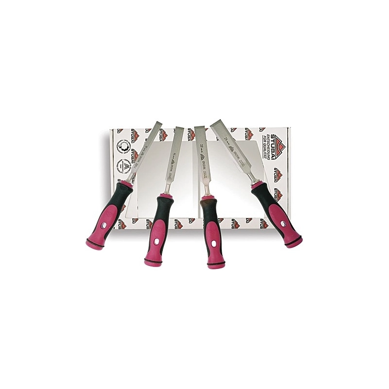 Set di 4 scalpelli per falegnami di misure 12, 16, 20, 24 mm. Impugnatura bicomponente. Lama in acciaio forgiato e temperato. Made in Austria.