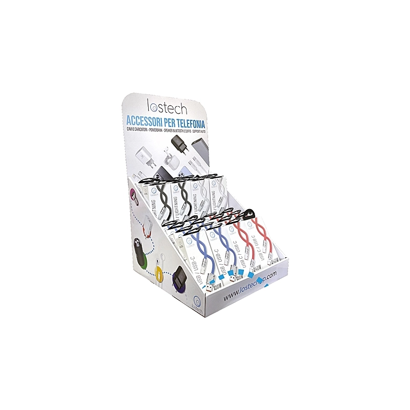 Espositore composto da 28 cavi di ricarica: 12 cavi 120W USB-LIGHTNING, 8 cavi 120W USB-TYPEC e 8 cavi 240W TYPEC-TYPEC. Tutti i cavi sono da 150 cm.