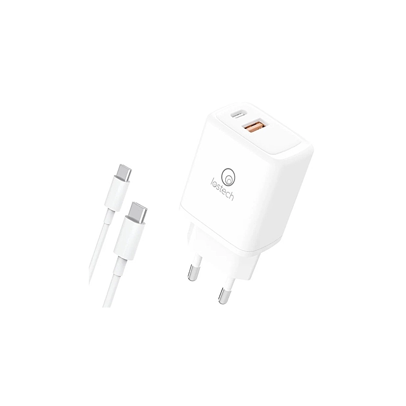 Spina con ricarica rapida, 30 Watt. Con 1 presa USB-C e 1 USB-A. Con cavo da 1,2 mt USB-C - USB-C