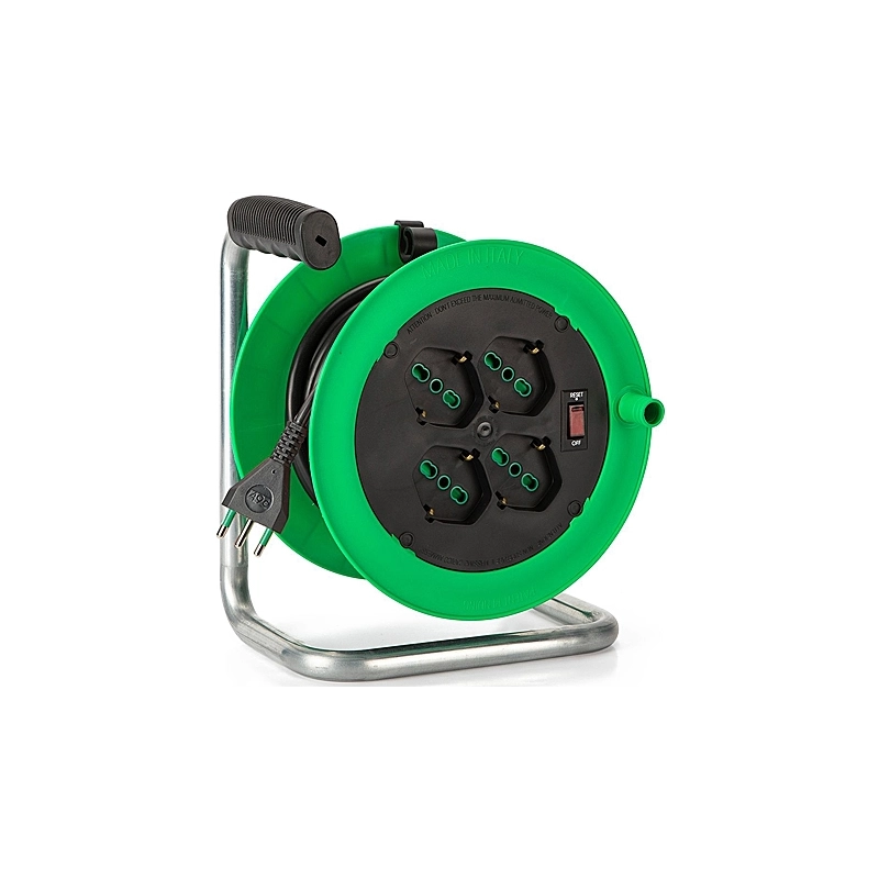 Avvolgicavo diametro 195 mm. Spina Italia 2P+T 10A. Cavo da 10 mt 3G1 H05VV-F. 4 prese bipasso italo/tedesche 2P+T 16A. Interruttore automatico luminoso di sovraccarico. IP20. Colore verde.
