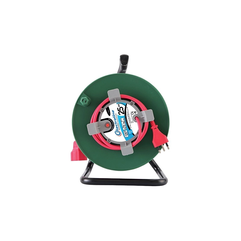 Cavalletto in acciaio, tamburo in polipropilene. Spina su avvolgicavo 2P+T 16A. 1 presa Schuko 16A. Cavo Sezione 3 x 1,50 mm2. Con disgiuntore. Lunghezza cavo 25 m