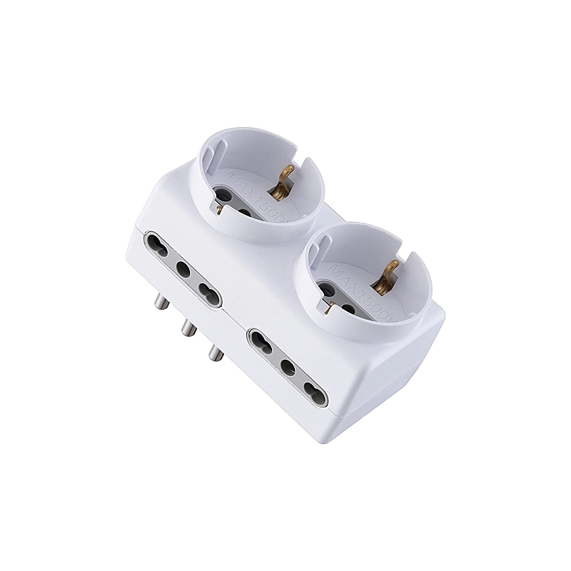 Adattatore con spina 16A, multipresa da 6 posti di cui 2 schuko e 4 bivalenti 10/16A. Colore bianco.