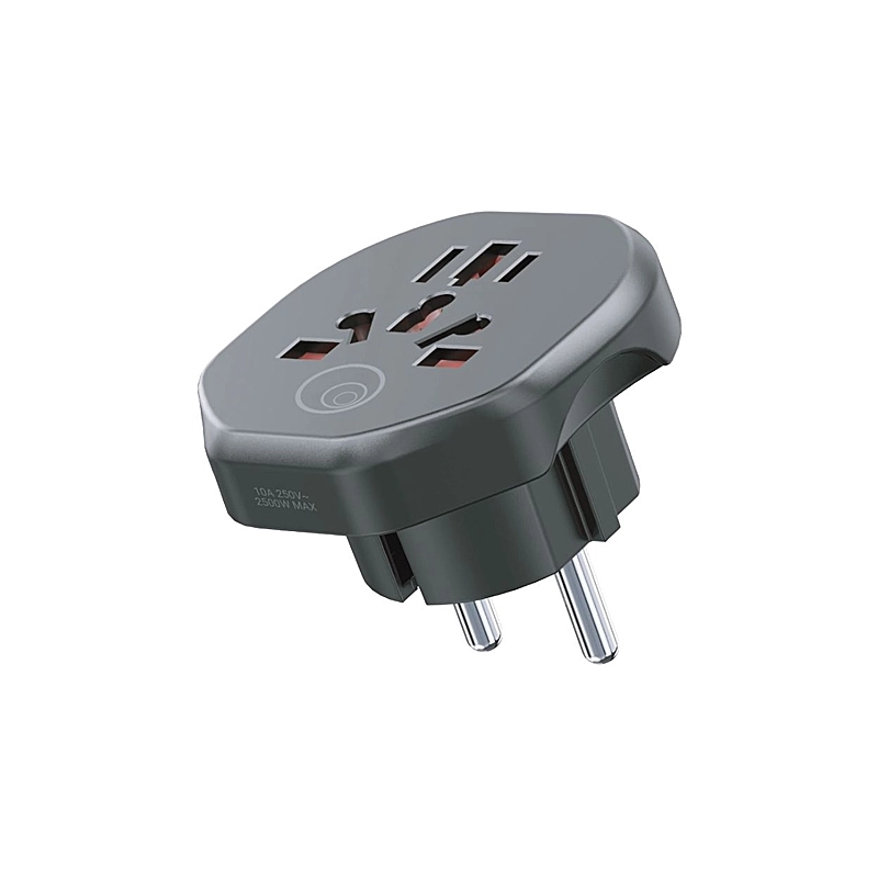 Adattatore da viaggio in policarbonato ignifugo con spina Shuko. Ricarica rapida 10A. Universale per molti paesi.