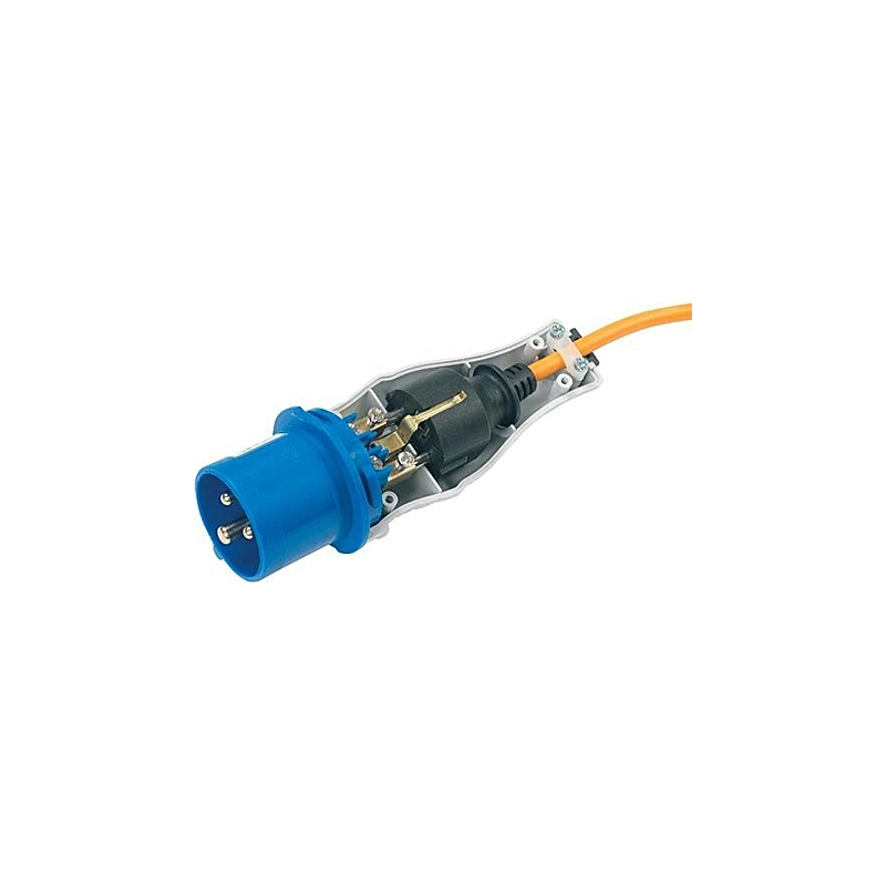 Spina industriale nella quale puo' essere cablata una spina Schuko in modo fisso. Una volta chiusa, la spina Schuko stessa viene nascosta e appare solamente la spina industriale. Protezione IP44. A Norma CEE. Senza morsetto messa a terra.
