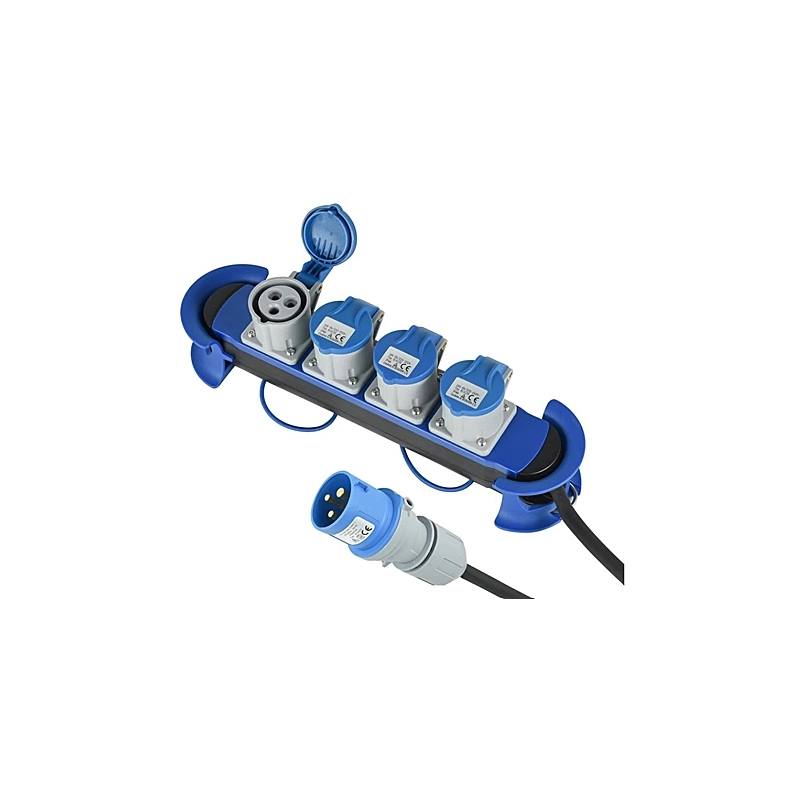 Moltiplicatore industriale con cavo e spina CEE blu - 4 Prese 2P+T 16A CEE IP44. Cavo in gomma da 3 mt H07RN-F 3G2,5 mmq.