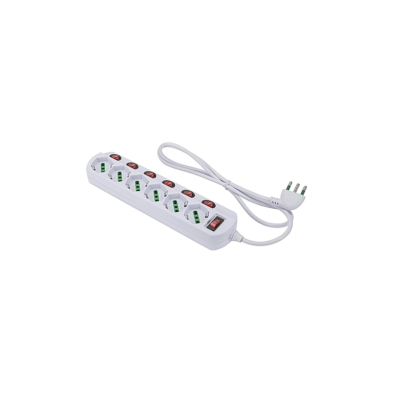 Multipresa con 6 prese bipasso italo/tedesche 2P+T 16A. Con interruttore luminoso su ogni presa. Cavo da 1,2 mt 3G1 H05VV-F. Spina a squadra italiana 2P+T 16A. Con interruttore luminoso generale. Colore bianco.