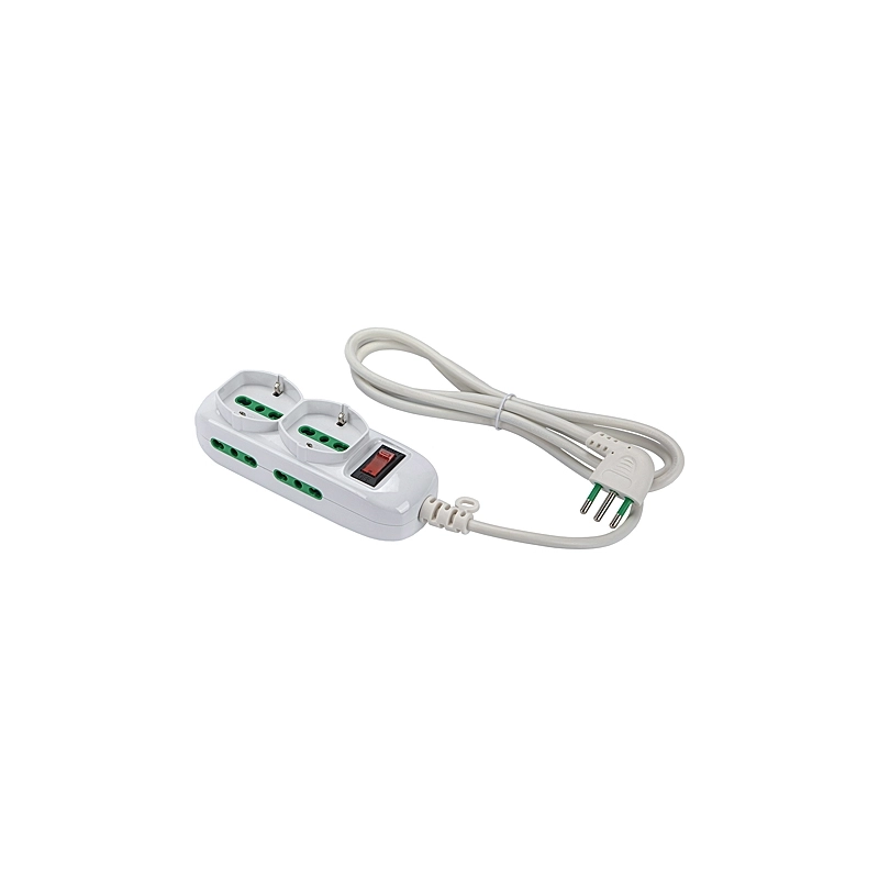Multipresa con 2 presa bipasso italo/tedesca 2P+T 16A e 4 prese bipasso italiane 2P+T 16A laterali. Cavo 1,5 mt 3G0,75 H05VV-F. Spina a squadra italiana 2P+T 10A. Con interruttore automatico luminoso di sovraccarico.