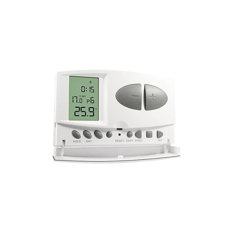 Cronotermostato settimanale programmabile. Indicazione livello batteria scarica. Funziona con 2 batterie AA non fornite. Colore bianco. Dimensioni 130x80x35 mm.